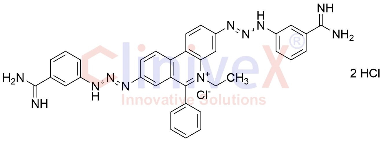 | Chemical Name: | 3,8-Bis((E)-3-(3-carbamimidoylphenyl)triaz-1-en-1-yl)-5-ethyl-6-phenylphenanthridin-5-ium chloride Dihydrochloride |
