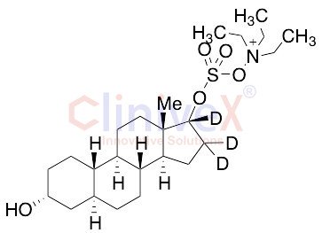 | Chemical Name: | triethyl-[[(3R,5S,8R,9R,10S,13S,14S,17R)-16,16,17-trideuterio-3-hydroxy-13-methyl-1,2,3,4,5,6,7,8,9,10,11,12,14,15-tetradecahydrocyclopenta[a]phenanthren-17-yl]oxysulfonyloxy]azanium |